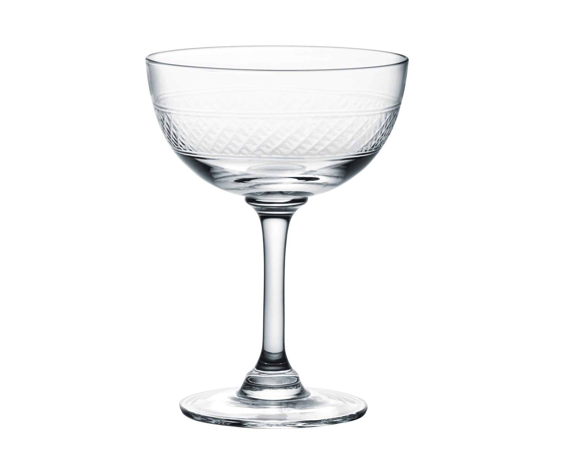 Crystal Champagne Saucers with Bands Design: Each glass has been hand-blown and hand-decorated with a delicate, hand-cut latticed band.