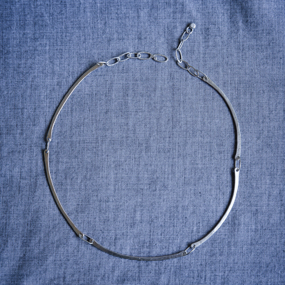 The Bones necklace is a handmade choker style sterling silver necklace that is elegant and edgy. Approx. 16” and adjustable with a hand forged silver drop.