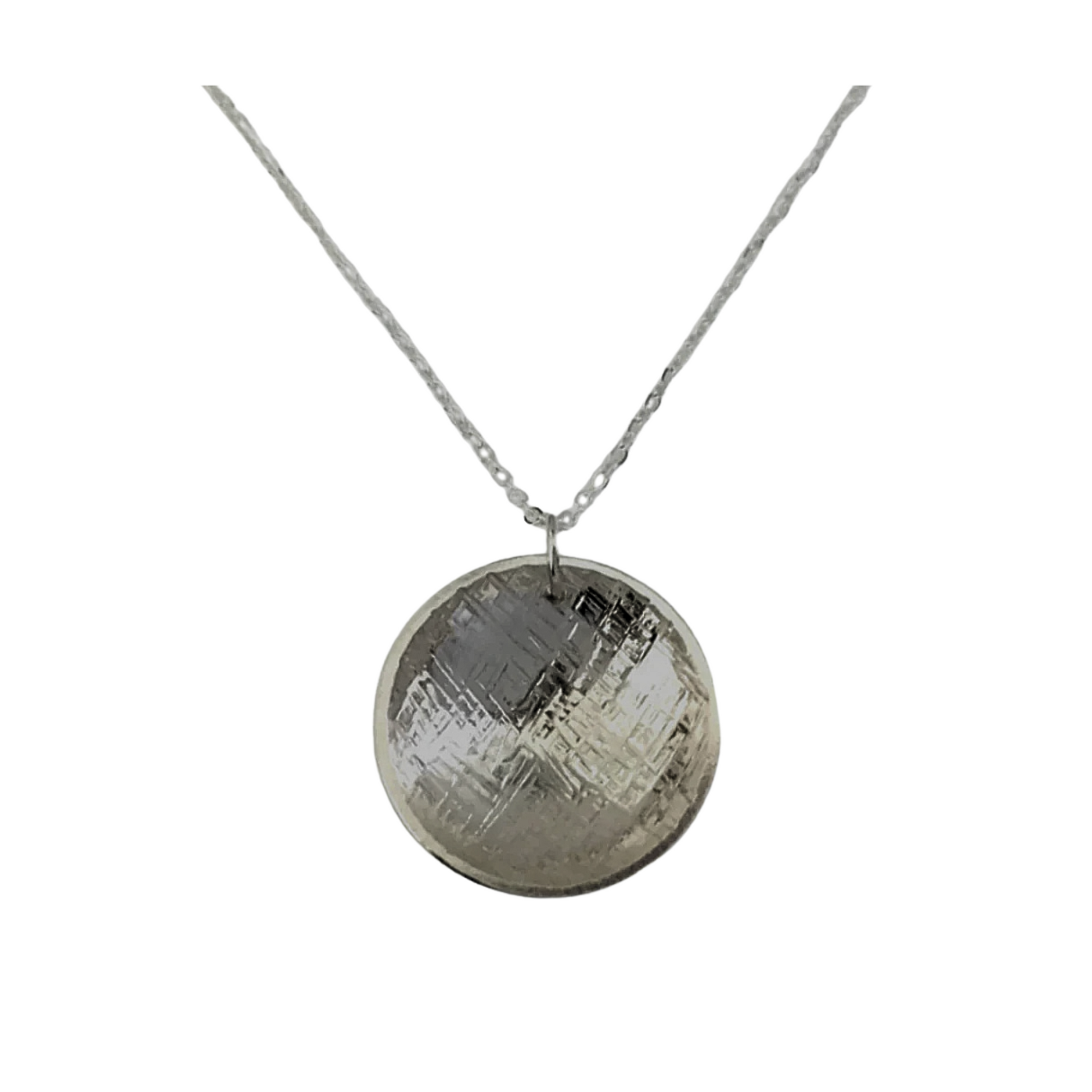 Concave, textured pendant with hatch pattern on an 18" chain. Choose Small (18mm) or Large (24mm) pendant. Available in Silver, Dark Silver, 24k Gold Vermeil and Rose Vermeil.