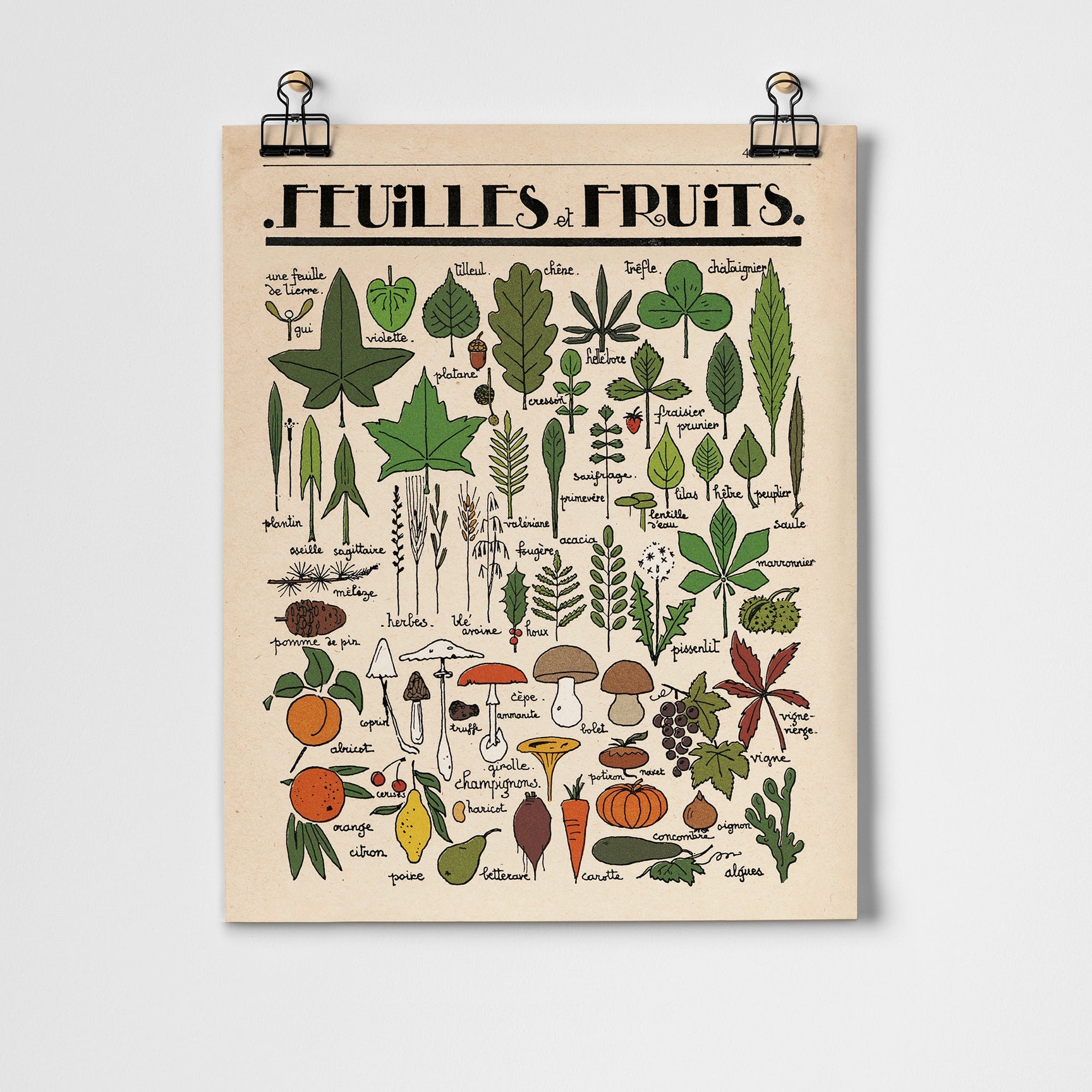 Charmant, non? This 1930's vintage 'Feuilles et Fruits' educational illustration was discovered in a dusty stack of school books at a flea market in Paris and carefully restored it to create this unique art print.