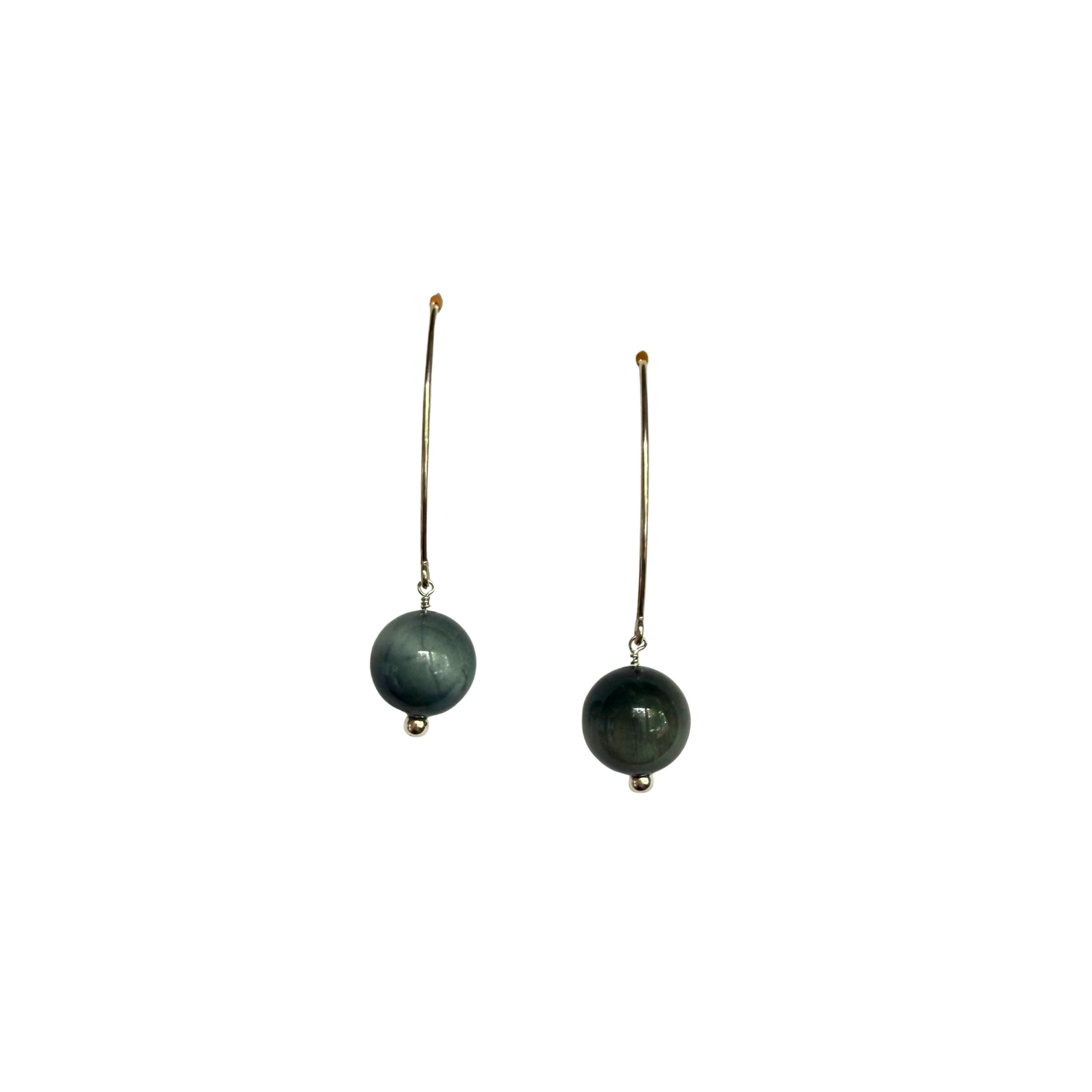 These earrings are made with natural Cat's Eye stones and silver rounds, dangling from marquis earwires.