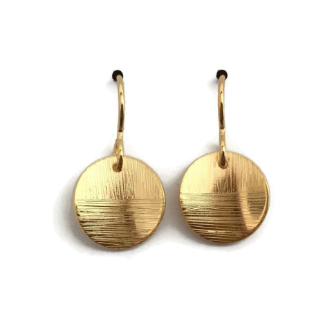Sweet, dainty earrings with hand-engraved pattern. Earrings measure 1/2" and hang at approx 7/8" from French style earwire.