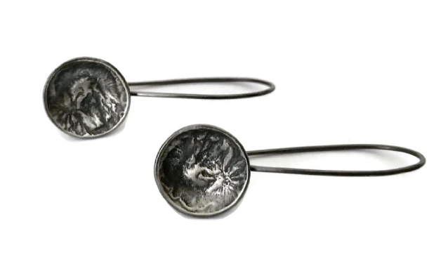Reminiscent of the Moon's surface, these dark silver textural earrings are part of Rain City Forge's Lunar Landing series. Earrings measure approx 2 in. long and .75 in. wide.
