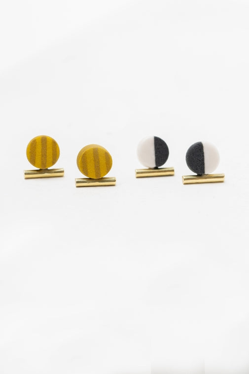 As always, bold color and geometry are at play here, and wearing the brass bar at the top, bottom, or either side is dealer’s choice! Pair them with your favorite dress for a night on the town, or with a white tee and jeans - they’re happy just about anywhere.