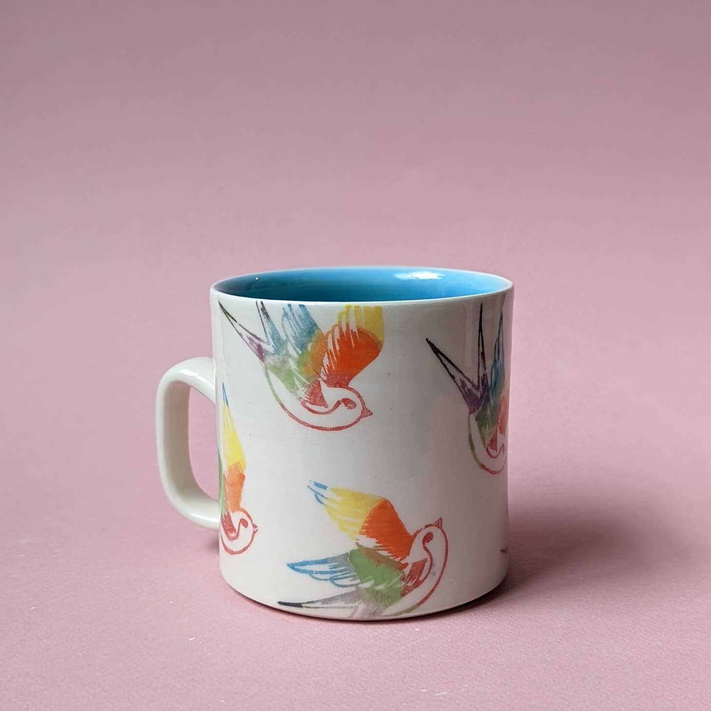 Meet your new favorite mug! Handmade and wheel thrown using a porcelain clay body, this colorful mug will make you oh so happy drinking your favorite things. Printed with birds in the colors of the rainbow, this mug has a clear gloss outer finish and is glazed in bright blue on the inside. Microwave & dishwasher safe.