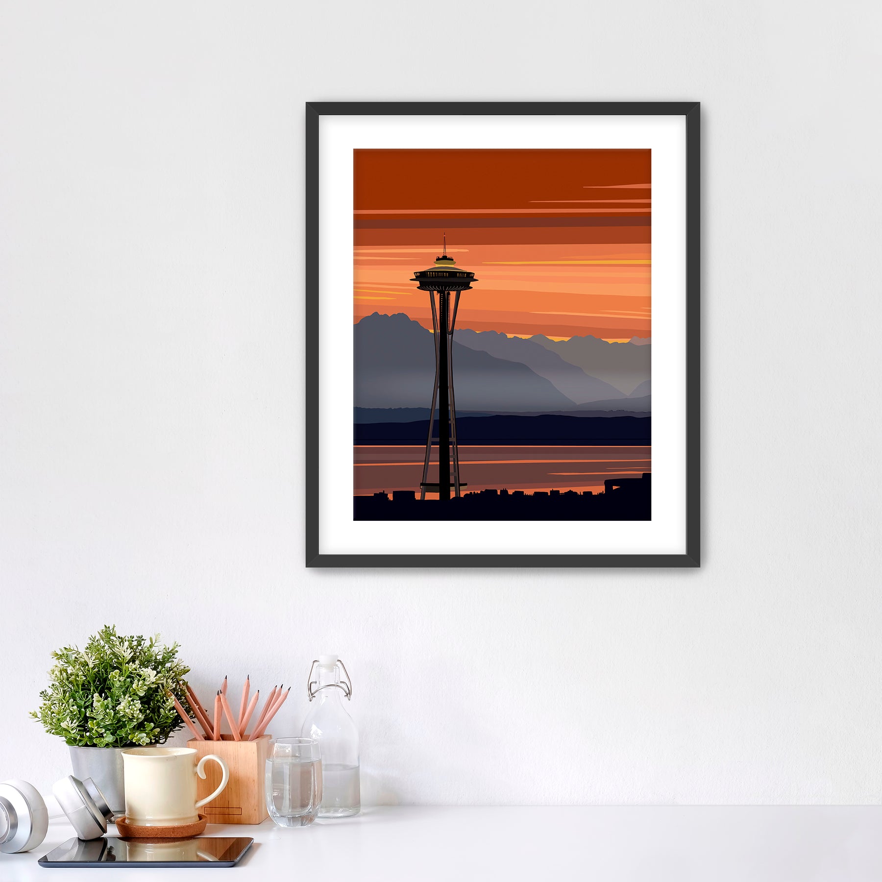 Contemporary artwork of the Seattle Space Needle at sunset.