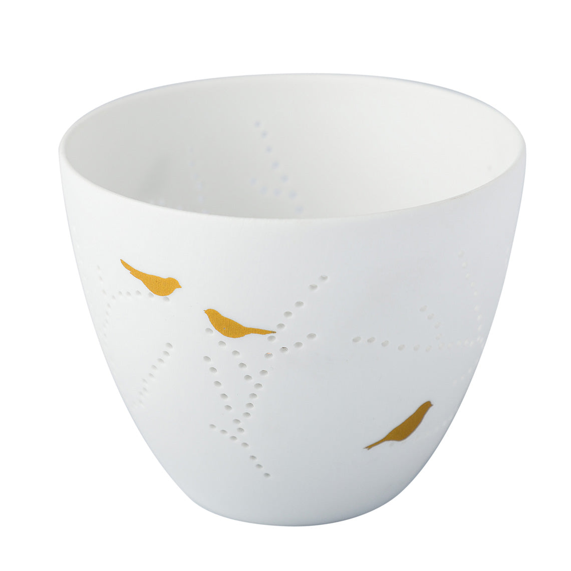This Tealight Lantern with its beautiful bird design is a delicate, handcrafted work of art. A candle on the inside gives a warm glow and paints poetic pictures when the light shines through the tiny cutouts arranged in the shape of tree branches. Elegant gold birds grace the branches of the container.