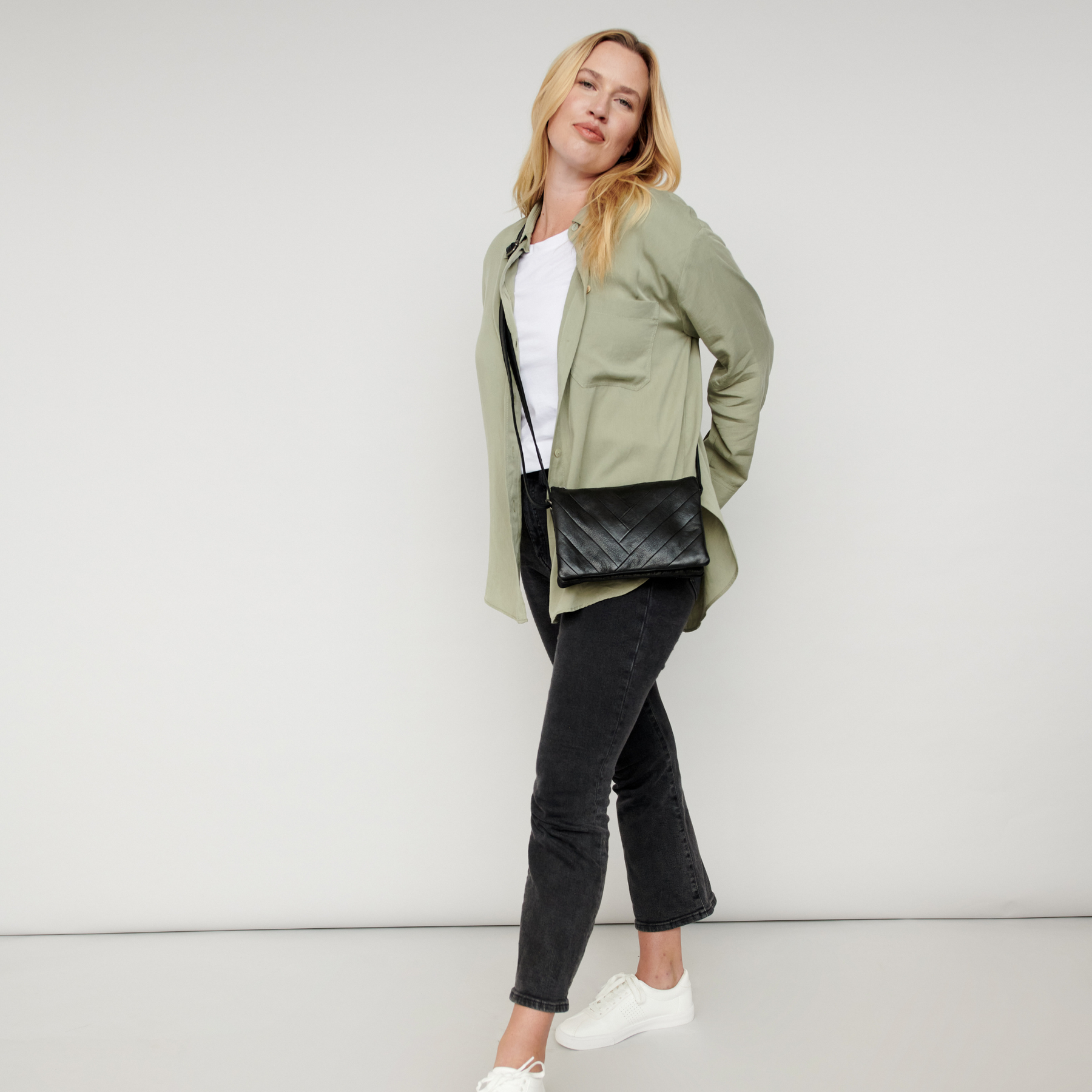 Herringbone pattern elevates the modern simplicity of this oh-so-organized crossbody. Unzip the main compartment + 3 interior divided sections are revealed