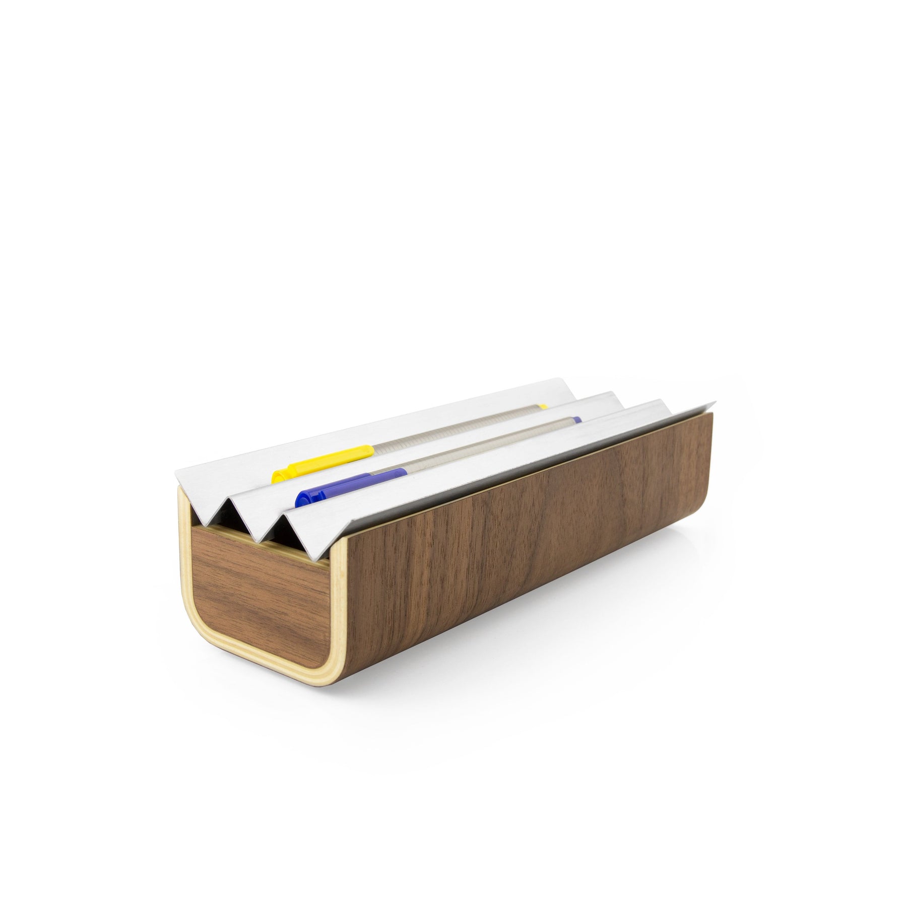 The bent plywood desktop collection is perfect for jewelry, makeup, art materials, office supplies... Most-used items are cradled atop the metal lid for quick easy access.