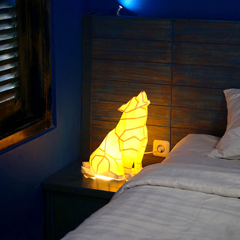 Presented in seated position and howling at the moon, this 3D kirigami wolf paper lamp made out of paper gives off a warm glow to inspire relaxation and reflection.